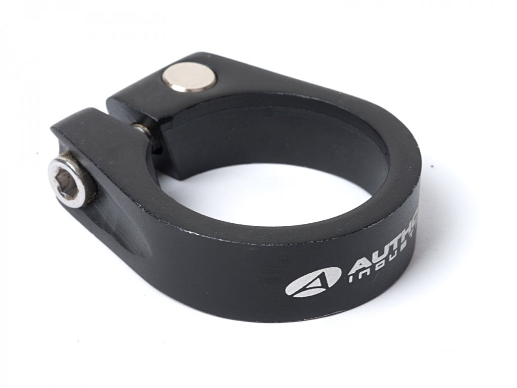 Podsedlová objímka AUTHOR. Odlehčený tvar vyrobený ze slitiny hliníku. Ocelový šroub a matice zaručují dlouhou životnost, pevné dotažení sedlovky v rámu.
