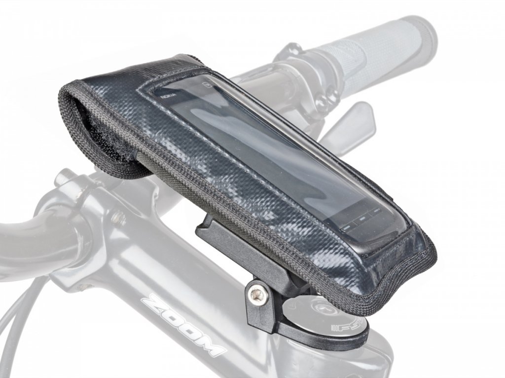 Brašna na představec určená pro telefony s dotykovým displejem, upevnění pod krytkou hlavového složení, brašna má speciální vyztužení, univerzální držák umožňuje velmi snadné sejmutí / upevnění.
